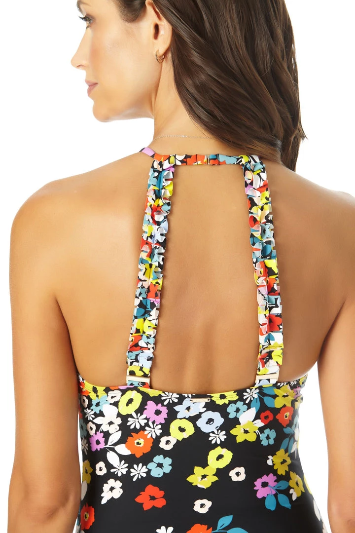 Make a splash at the beach with this eye-catching High Neck Swimsuit with Ruffle Straps. This one piece swimsuit features a beautiful high neck design and a bright floral print that will turn heads in any setting. Elegant ruffle straps and shirred sides ensure a figure-flattering fit for your silhouette. You’ll be lounging in all day comfort and style under the sun.
