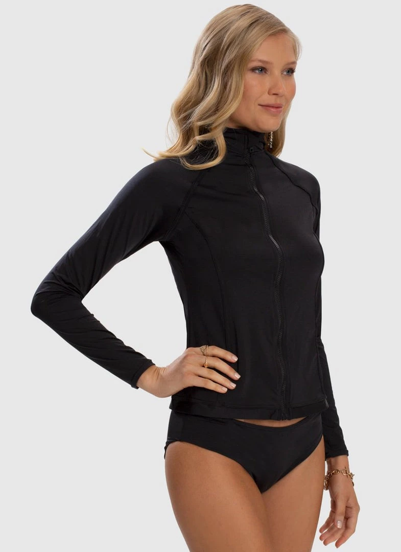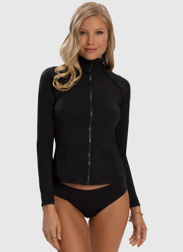 The Raven Long Sleeve Rash Guard by Aqua Blu Australia boasts a UPF sun protection rating of 50+ and features a high neck collar and open-end front zipper.