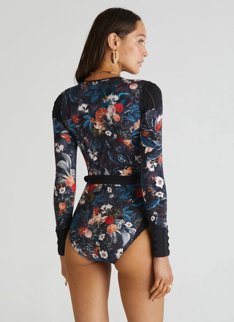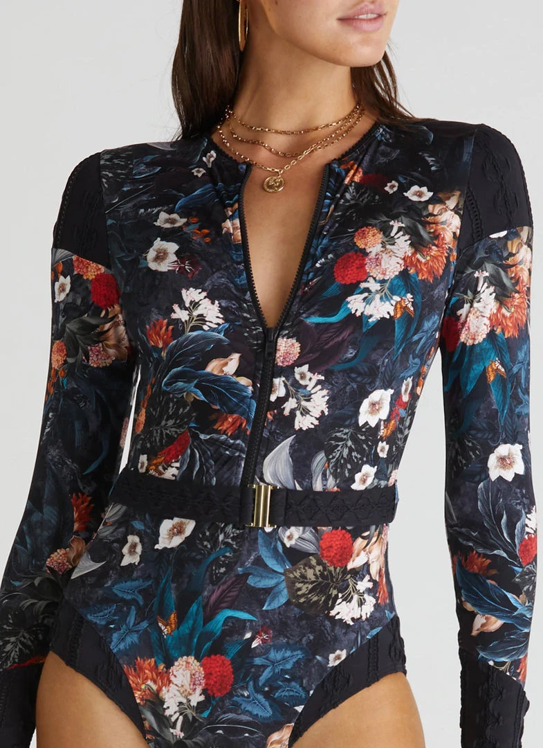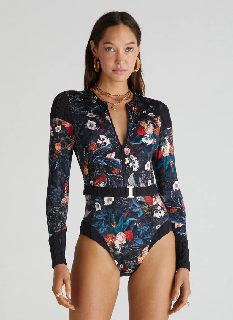 The Abundance Moresby One Piece by Aqua Blu Australia is a long sleeve one piece with jacquard wrist, shoulder and side leg panels designed to protect harmful UVA and UVB rays. The ultra-soft luxury fabric and closed-end front zipper is designed to shape and support the body. Â