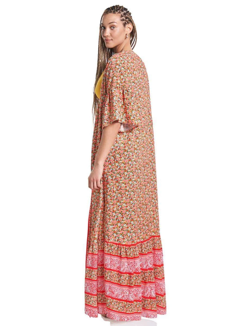 Josephine is a long and flowy beach cover-up that features a magical print and flounce hem. It has front waist-tie closure for a pulled-together look no matter where you are. This kimono has short sleeves that embellish the look, wear it close or as a layer!