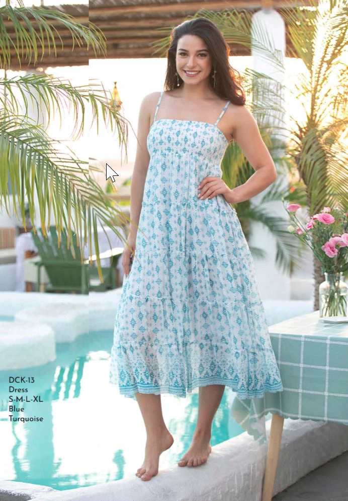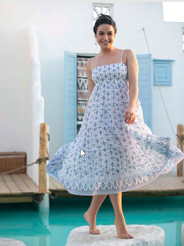 100% cotton voile printed tiered beach dress with tube top bodice and adjustable spaghetti straps. There is also a sheer underlay in the skirt – so not see through!