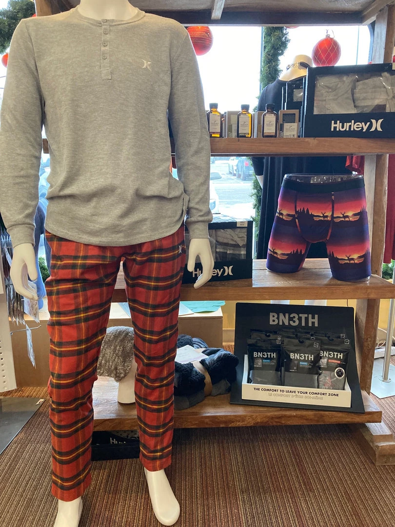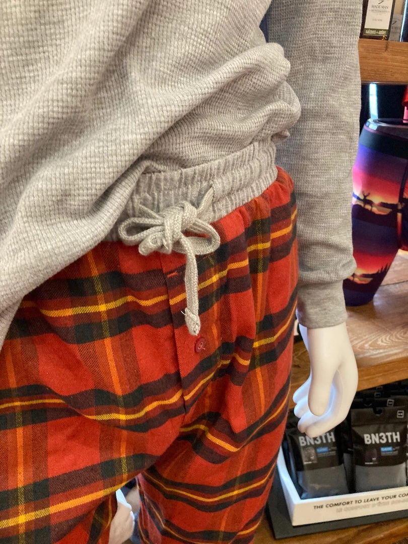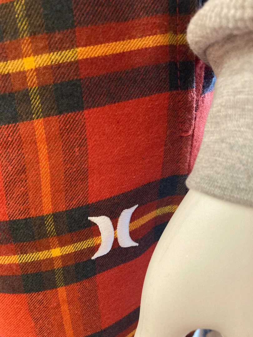 Hurley Men’s Lounge set. Plaid Flannel Pant with drawstring waist and long sleeve waffle shirt with embroidered logo detail.