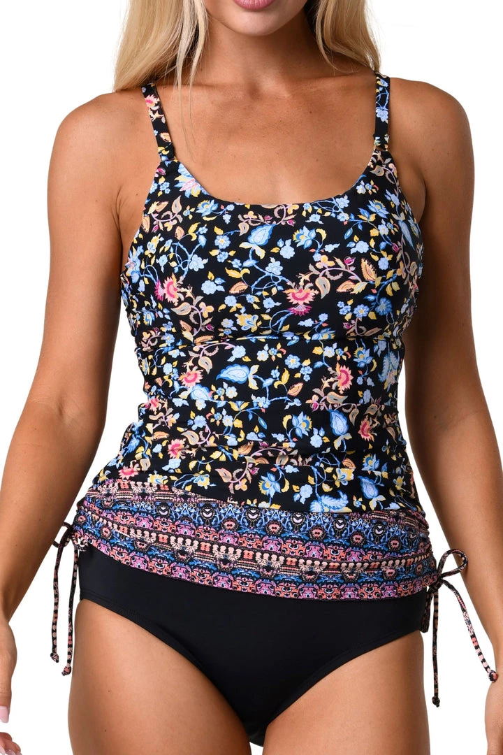 Our Budding Border Camikini Top is a tank style tankini top with adjustable straps for custom support and underwire and removable cups for added shape. This style also includes adjustable side ties that allow you to scrunch the top up and down for more/less stomach coverage and shirring.Â