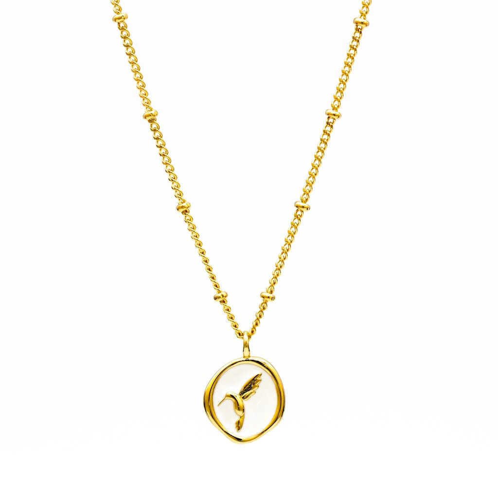 Enamel hummingbird pendant in white on a delicate, gold-plated ball detail chain. Measures 50 cm (pendant measures 11mm)