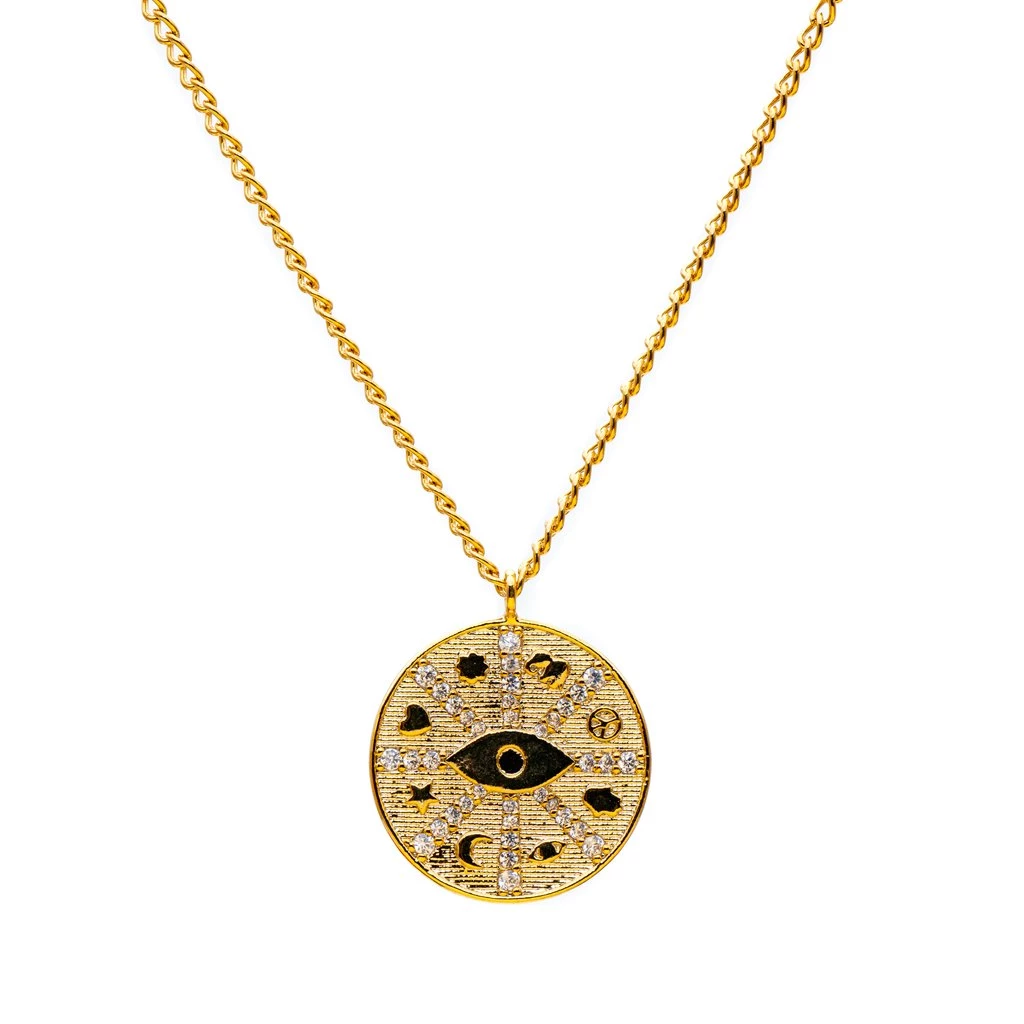 Gold-plated chain necklace with sparkly, round evil eye medallion.  Measures 40cm + 5cm extension