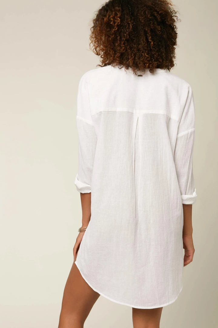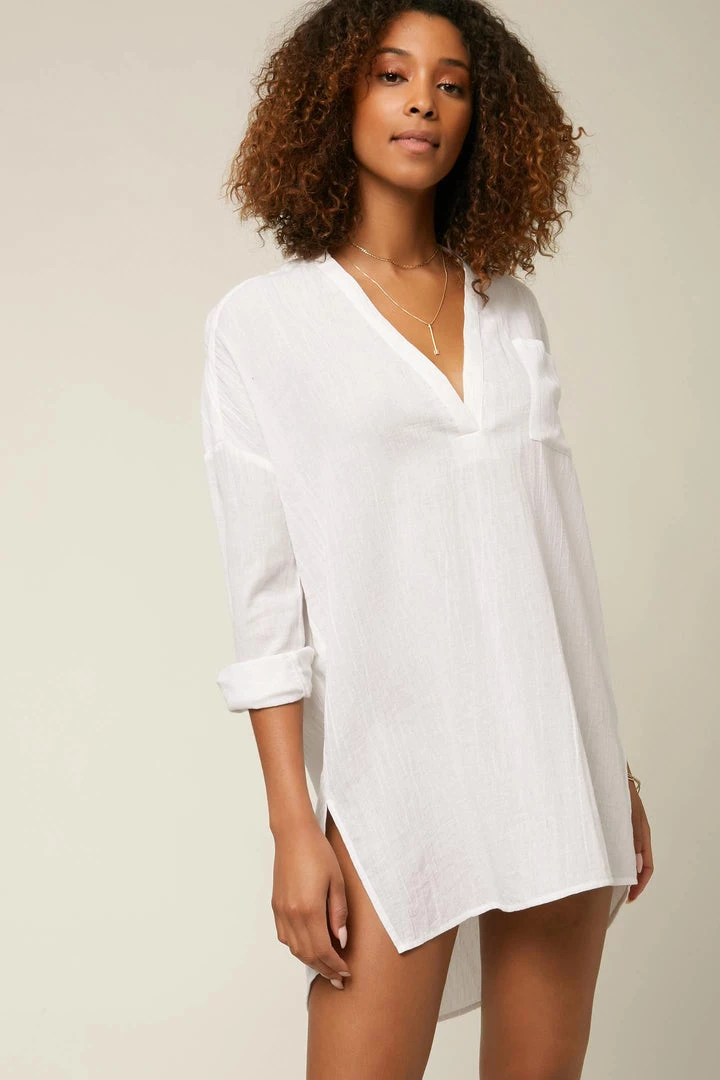 A flowy cover-up to elevate your beach look. It has a long sleeve design, saddle cut hem and v-neckline.