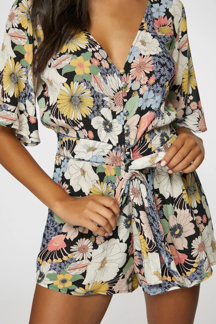 Make some plans in this stylish short sleeve romper. It features a colorful floral print, v-neckline with front button closure and ties at the waist.