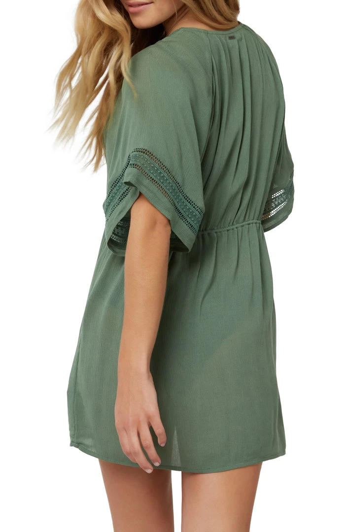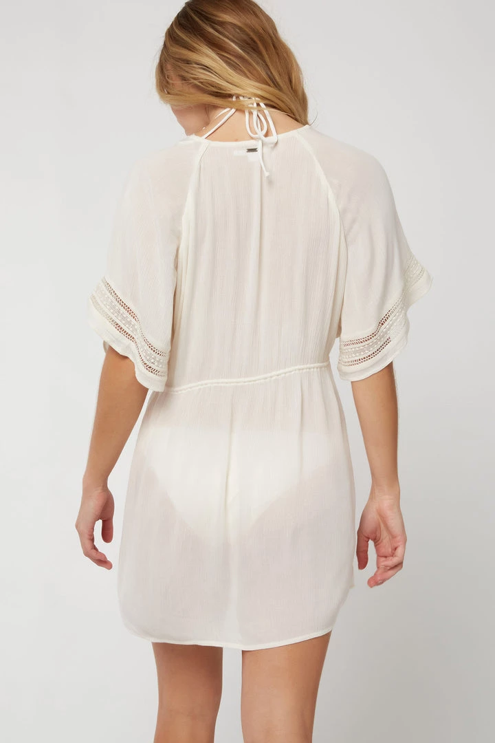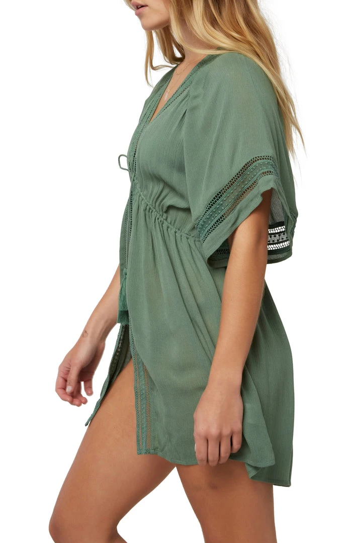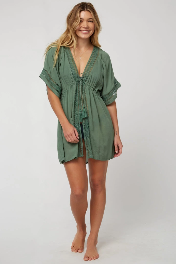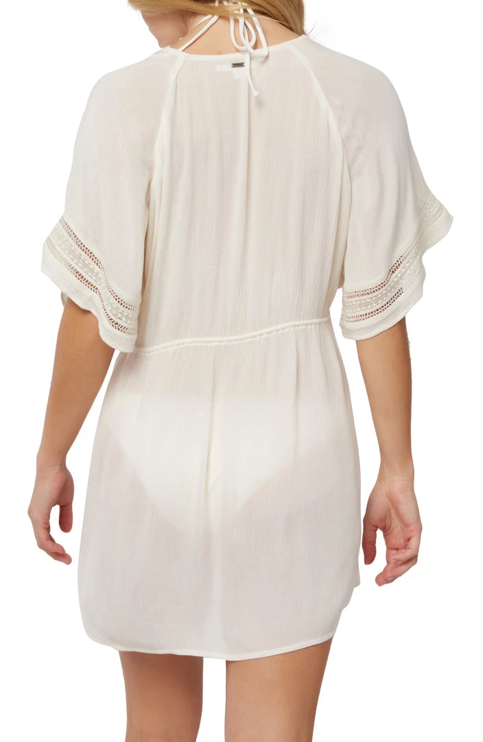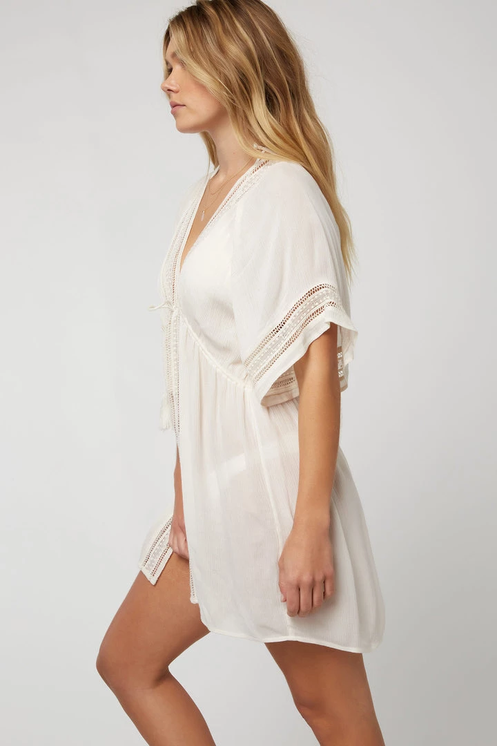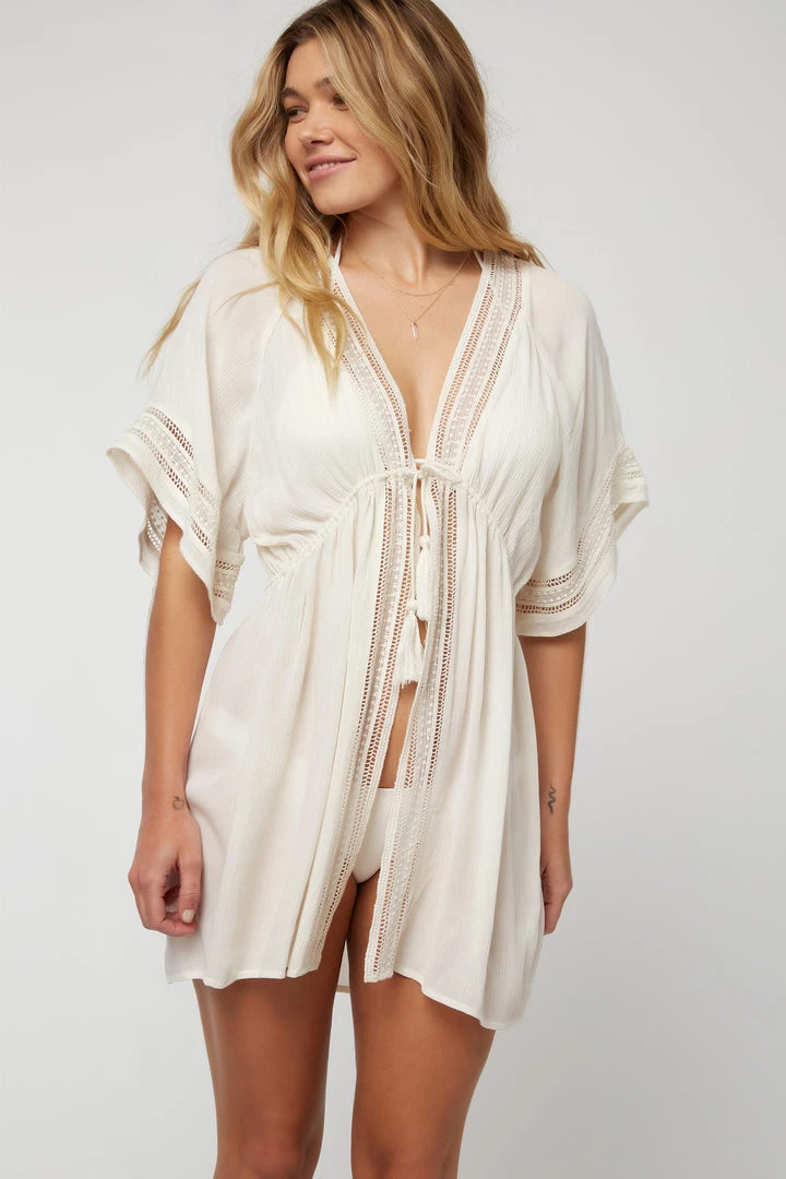Sweet and stylish cover-up dress that features a crochet design and open front with adjustable tie.