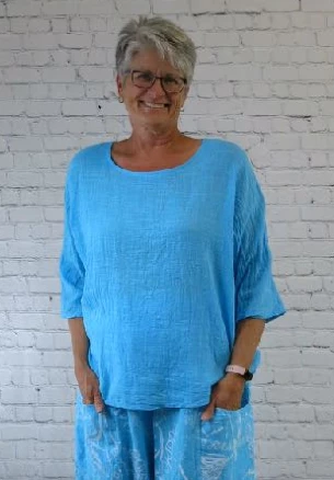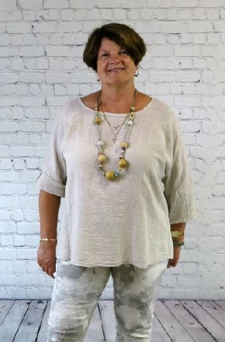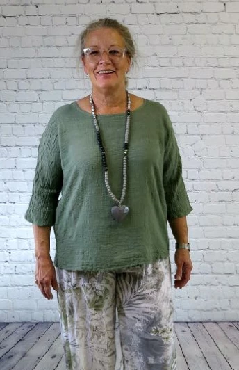 Beyond Capri 3/4 sleeve gauze top. solid color, round neck. 100% cotton gauze. One size fits most. comfortably fits size 8-14
