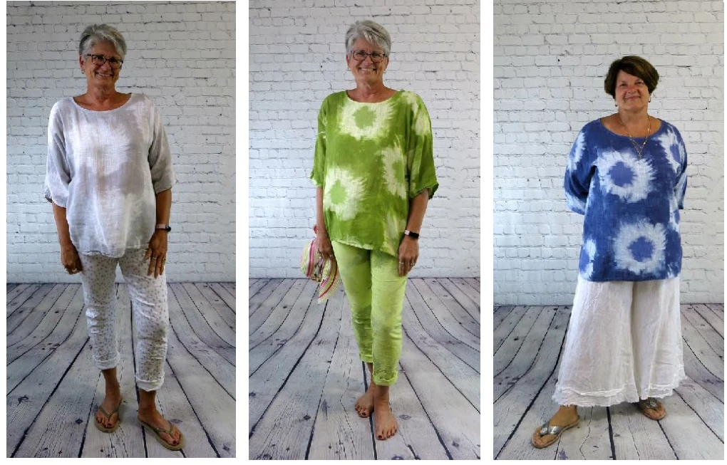 Beyond Capri 100% cotton flower burst tye dye print 2/3 sleeve top. Large waffle weave texture. One size fits most and comfortably fits size 8-14