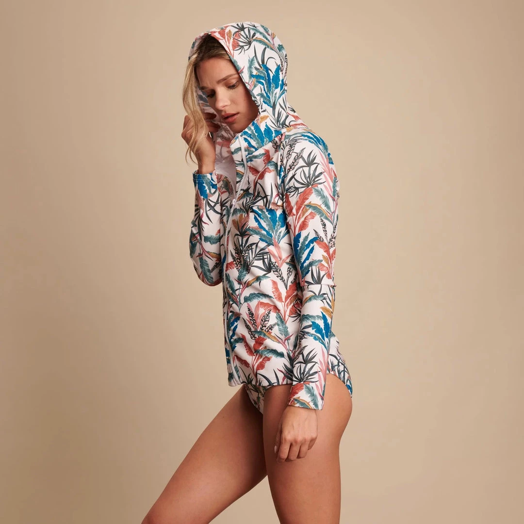 QUINTSOUL TULUM LONG SLEEVE HOODY RASHGUARD W/ZIP. All over print with nylon zipper, high neck hood to provide sun protection at front neck. Great SPF jacket!