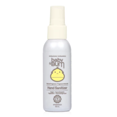 The Baby Bum Hand Sanitizer is a no-rinse antibacterial spray derived from sugar cane alcohol and infused with oils and fruit extracts. Tested to kill 99.9% of germs without harsh chemicals. Smells good and doesn’t leave a sticky mess.
