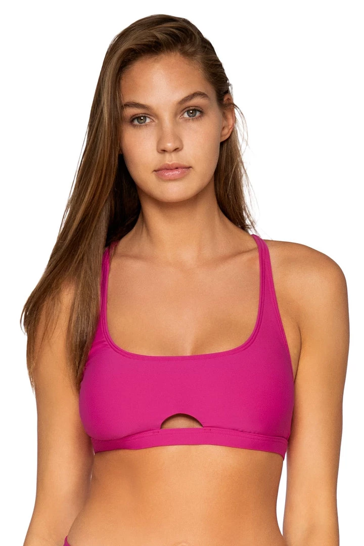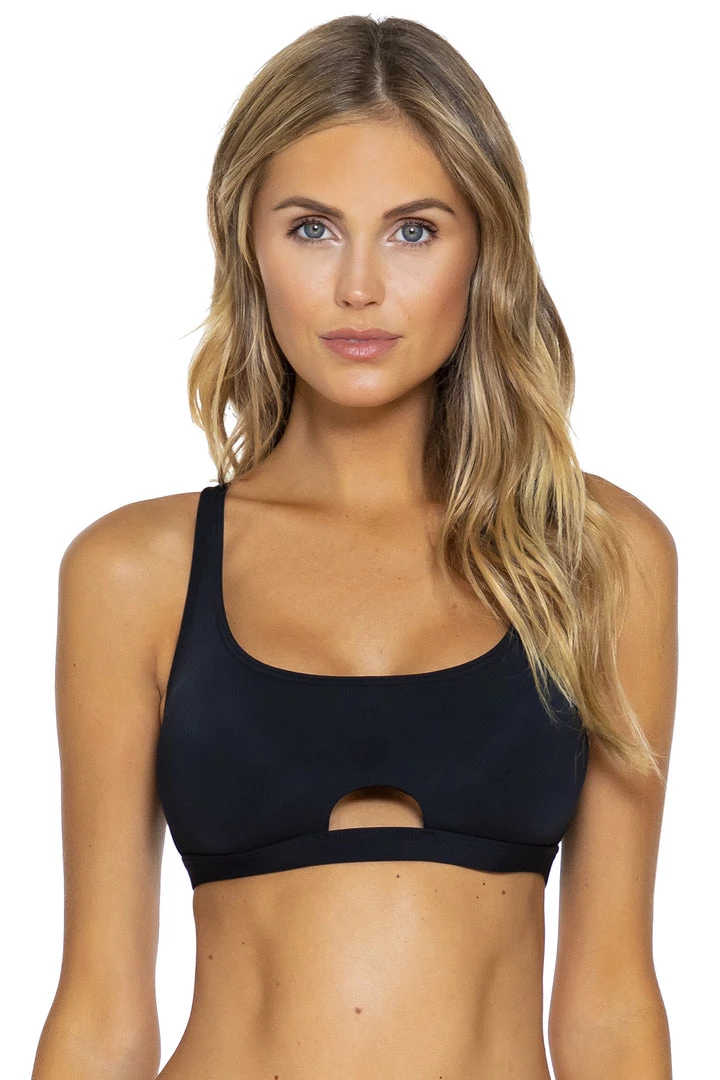 Functional, flattering, and customizable! Full adjustability in the back with criss cross strapping to ensure a perfect fit. Includes a removable front tie detail. Leave the tie off for a sports bra look or tie it in a bow for a deeper scooped front. Features include removable cups and matching colored lining.