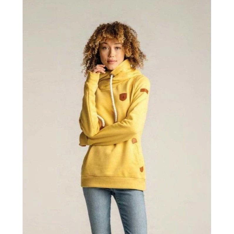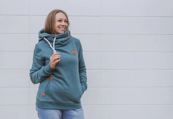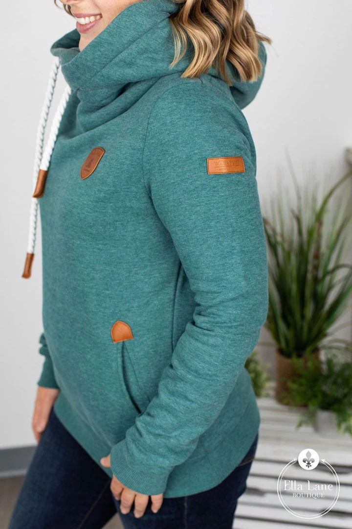 Prepare to be warm! The Artemis hoodie is perfect to keep you cozy and stylish. Complete with, cowl neck and adjustable rope straps, front pockets, vegan leather detailing, and brushed French terry interior.Â