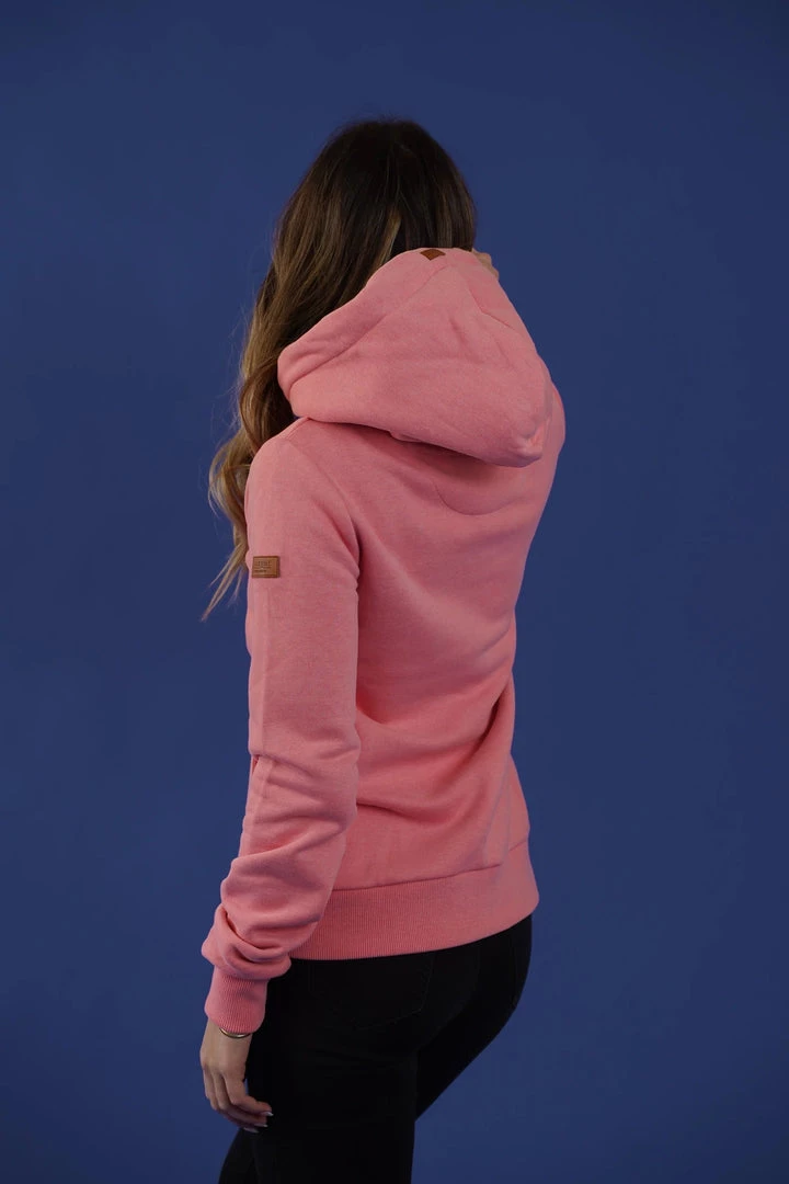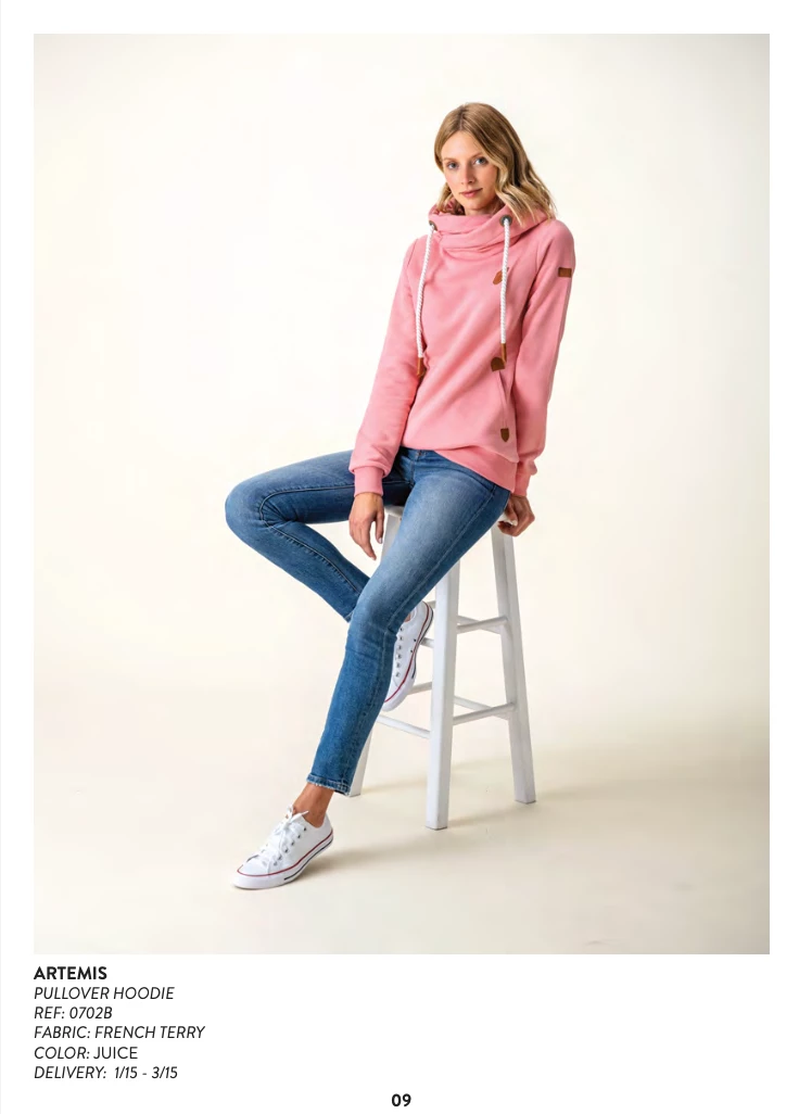 - Cowl neck hood with adjustable rope drawstrings and vegan leather caps