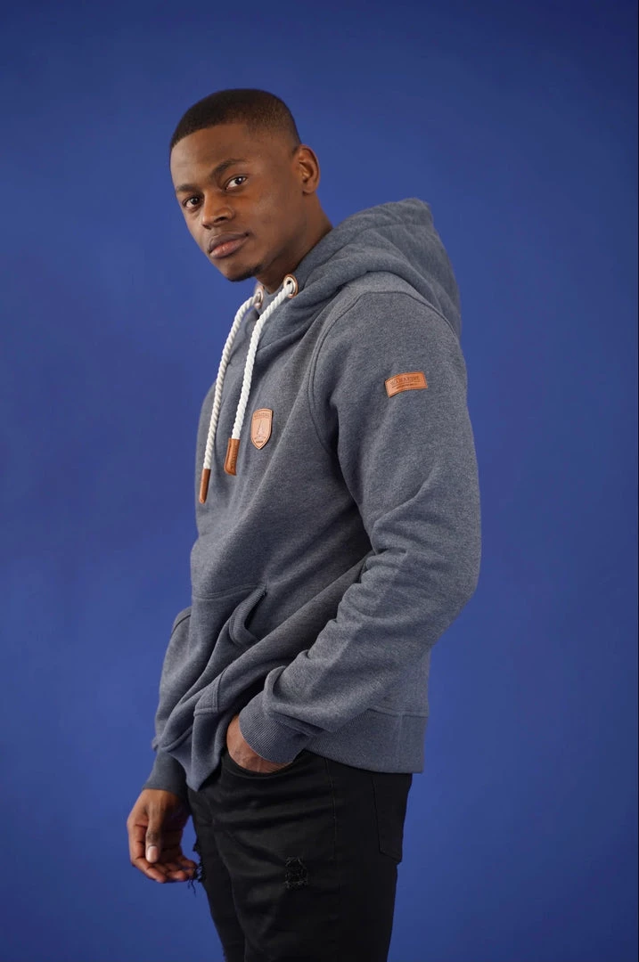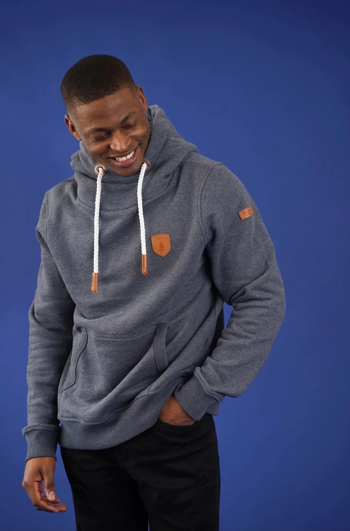 - Cowl neck hood with adjustable rope drawstrings and vegan leather caps