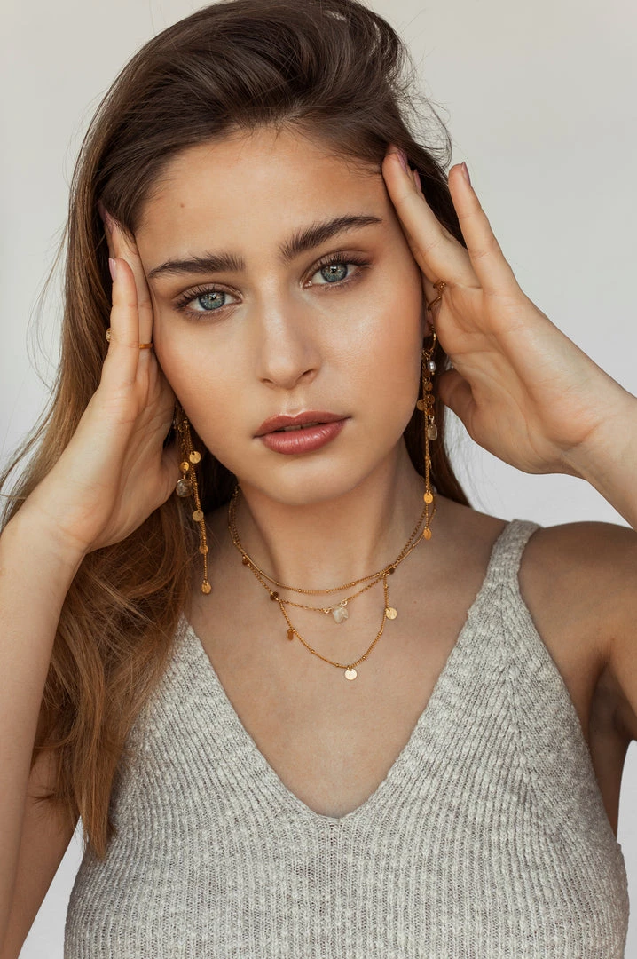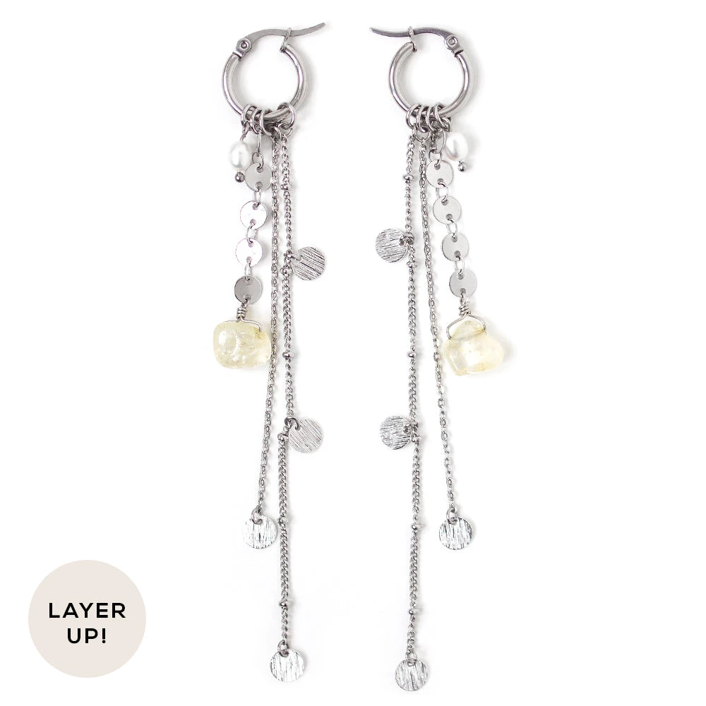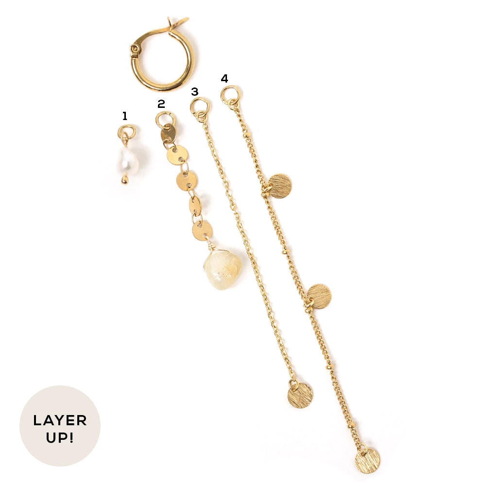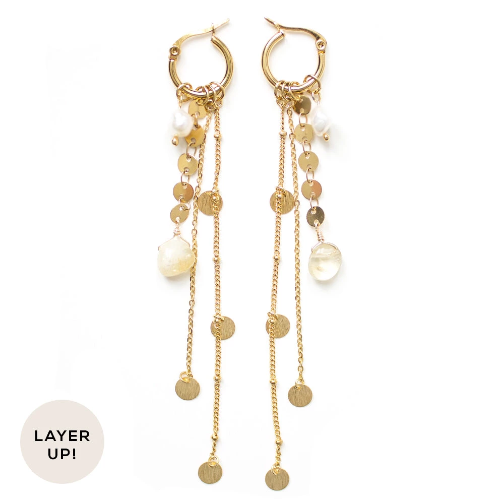 Honey long dangling gold or silver hoop earrings feature freshwater pearls, citrine stone and delicate 24K gold or sterling silver plated sequins. Slid on a stainless steel hoop, each chain pendant can be removed to create a personalized mix & match. Oh hun, let’s get creative! LAYER UP! Create a unique look to suit your style! Wear any piece alone or layered stylishly for a personalized look.