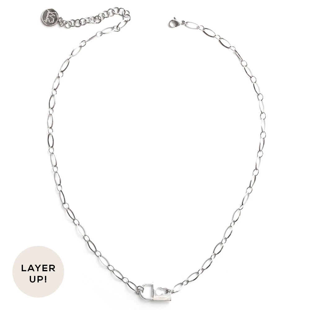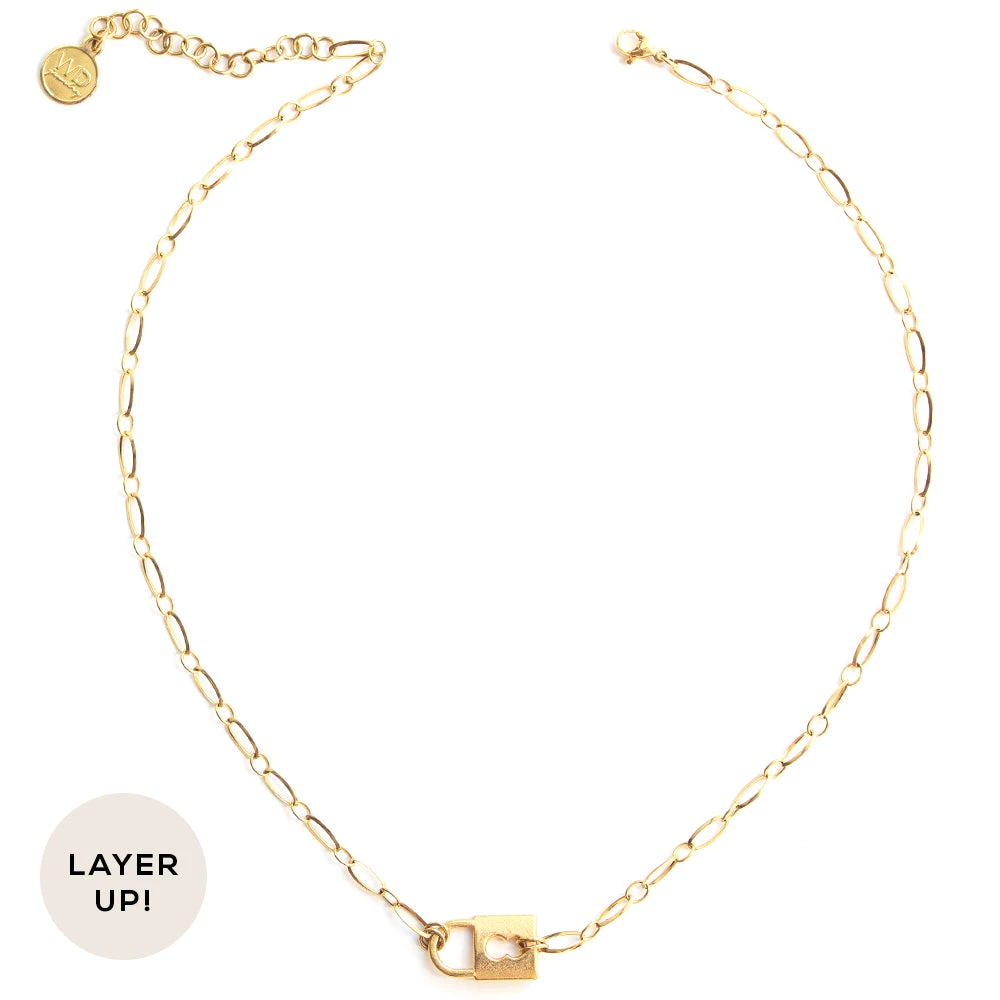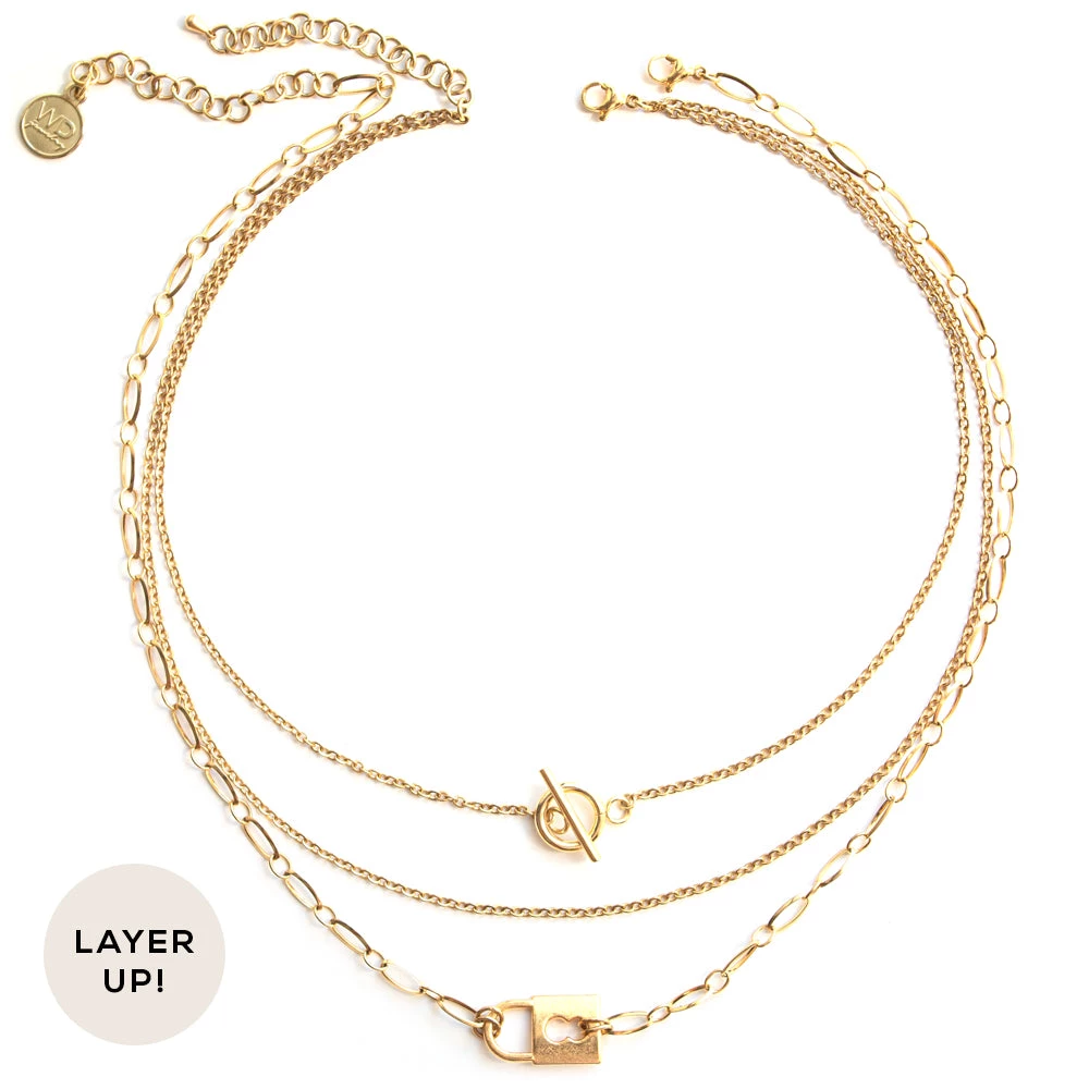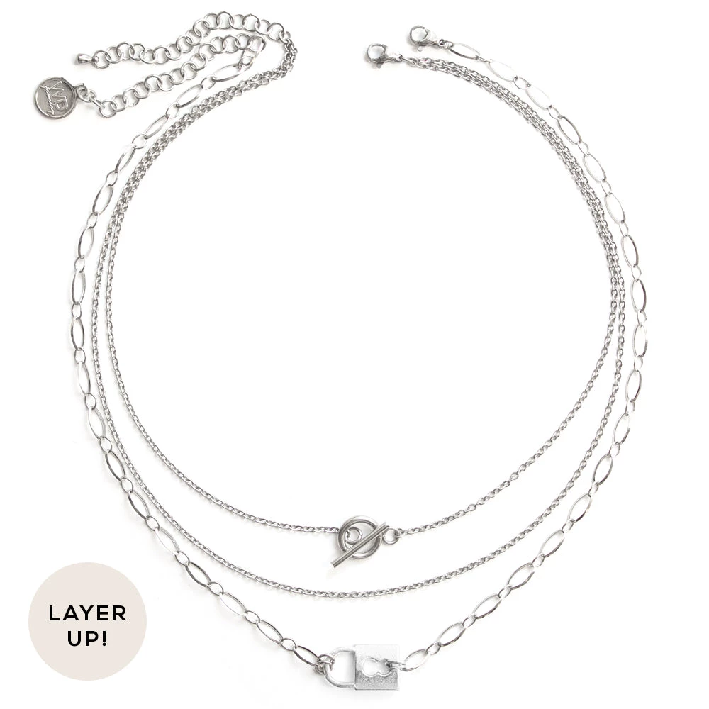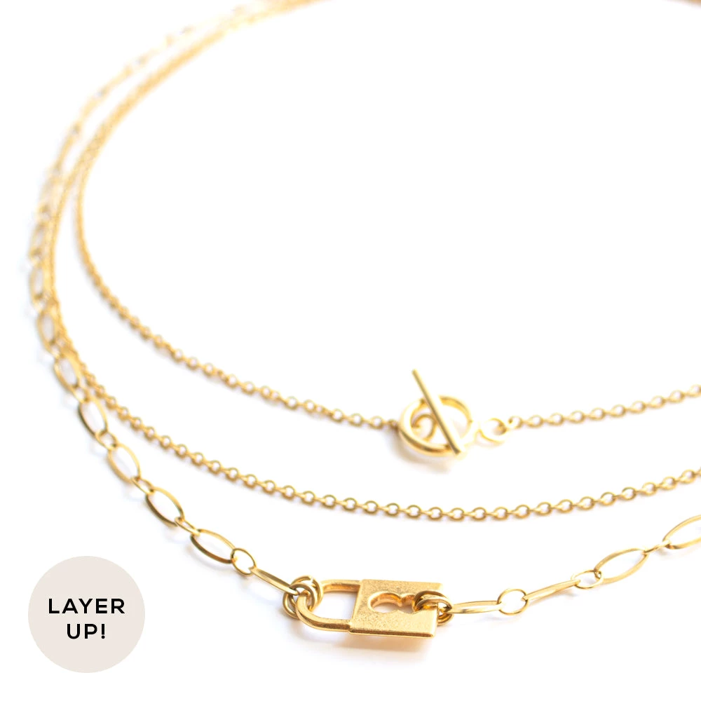 Luck is a two-piece gold or silver necklace set. The first necklace has two layers of plated delicate stainless steel chain and a toggle clasp as medallion. The second necklace is made of a Figaro chain adorned with a beautiful 24K gold plated lock for an edgy look! LAYER UP! Create a unique look to suit your style! Wear any piece alone or layered stylishly for a personalized look.