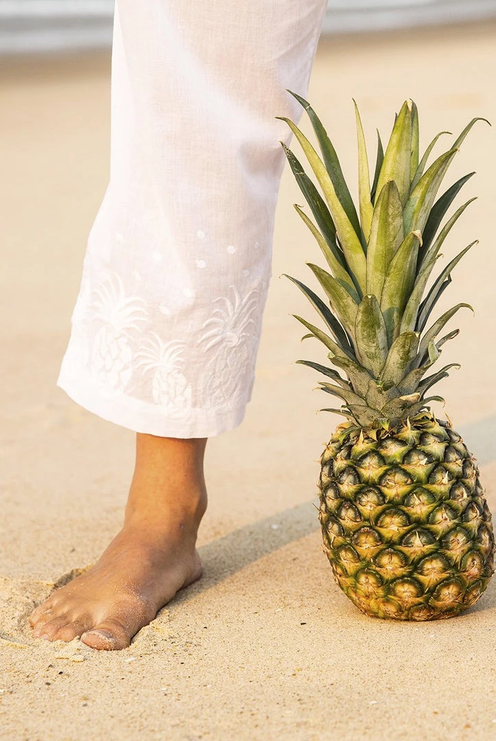 These cute elasticated ALOHA PANTS are made of pure cotton voile, and feature cute pineapples embroidered across the hemline. So comfortable to relax at home in your lockdown life, and ready for beach walks when we are allowed