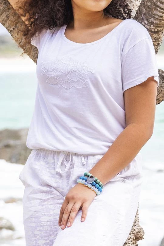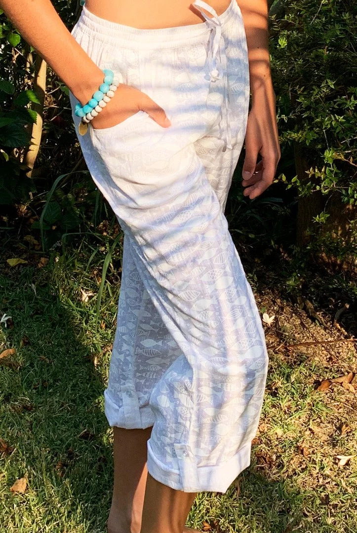 The cute little aquarium fish print gives a tropical feel to these cute white on white pants.